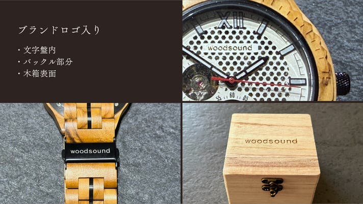腕時計の文字盤内、バックル、木箱の蓋の計3箇所に「woodsound」のロゴが入っています。文字盤のロゴはゴールドで高級感があります。
