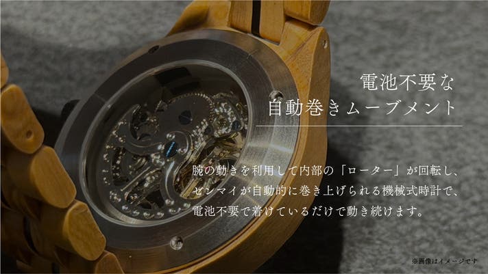 本製品は、腕の動きによって内部の「ローター」が回転し、ゼンマイが自動的に巻き上がる機械式腕時計です。電池は不要で着けているだけで動き続けます。あなたの腕の自然な動きでゼンマイが巻き上げられ、穏やかに時を刻み続けます。それはまるで、数千年を生き抜いたオリーブの木が、あなたの人生とともに、再び鼓動を始めるよう。