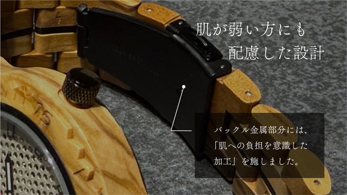 木製の時計はあれど、金属部分にまで配慮したものは稀です。本製品は、直接肌に触れるバックルも丁寧に仕上げ、「木だから、自然素材だから心配いらない」で終わることのない徹底した配慮を実現しました。
