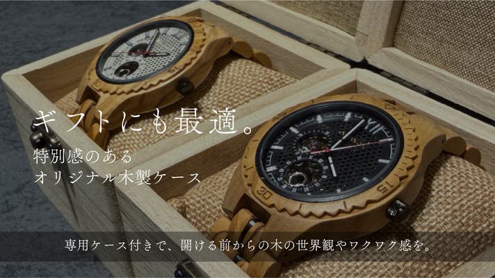 木製腕時計に合うようデザインした木製の特製ケースに入れてお届けします。開ける前から木の世界観、ワクワクを感じていただければ嬉しいです。