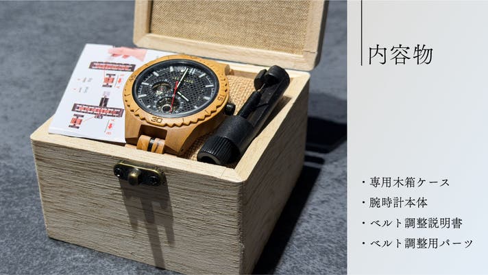 ・内容品:木製の特製ケース(外箱)、本体、ベルト調節の部品・説明書