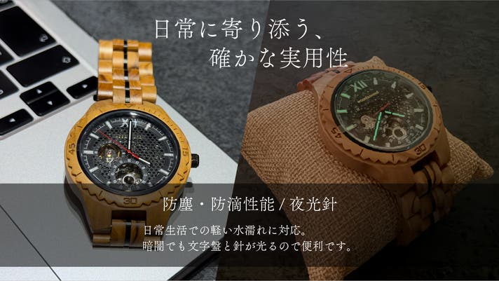防塵・防滴性能:木製腕時計ですが、突然の雨や洗顔時の水しぶきに心配する必要はありません。