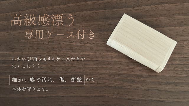 見た目も美しく、思わず触れてしまう手触りの良い天然木で、他とは一線を画すオシャレなUSBメモリです。同じ木材で製作される専用ケースも統一感があり、高級感を感じられます。