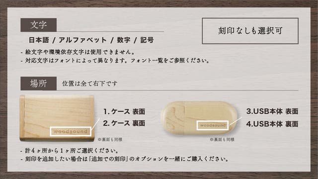 wood memoryには、あなたのお好きなで文字を自由に刻印できます。フォントも数種類ご用意しております。刻印する場所は計4ヶ所からお選びいただけます。刻印なしもご対応可能です。