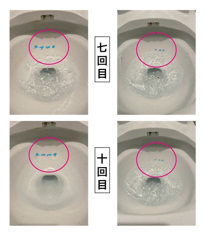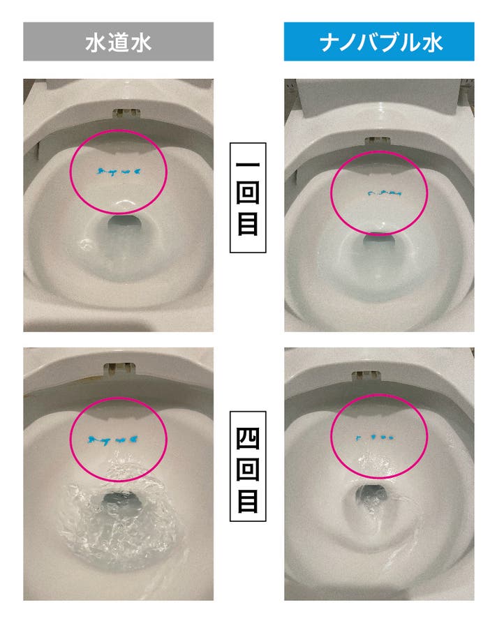 【試験方法】トイレの便器内に擬似汚れを塗布。水道水とウルトラファインバブル水を流す作業を10回繰り返した後、再び便器内の汚れ付着状態を観察・比較した。