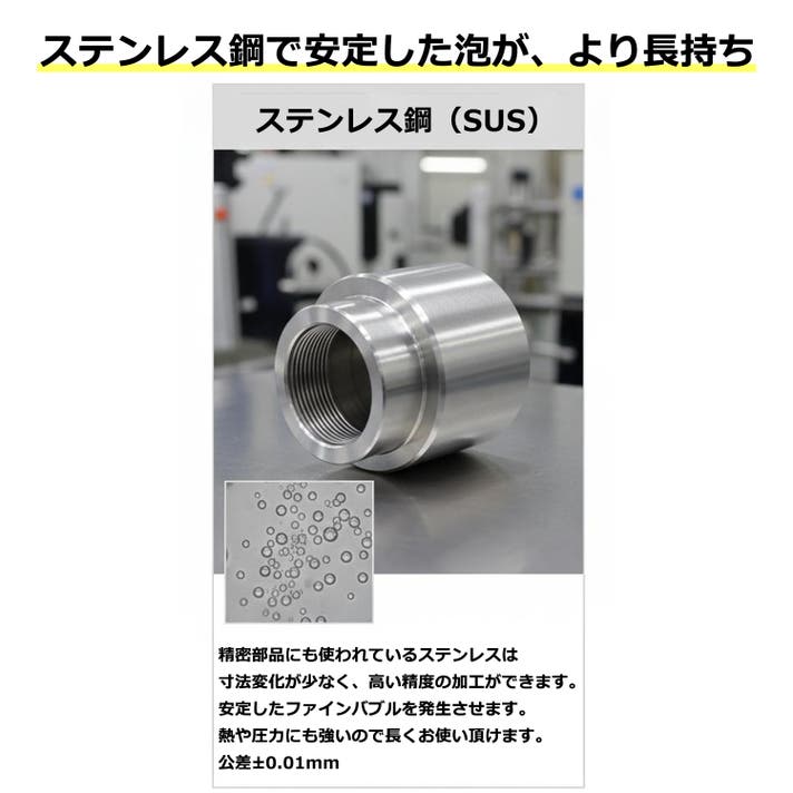 成形時の収縮変化により性能差が生じやすいため、私たちはミクロン単位で精度管理されたSUS304金属パーツを採用。安定したバブル発生を実現しています。