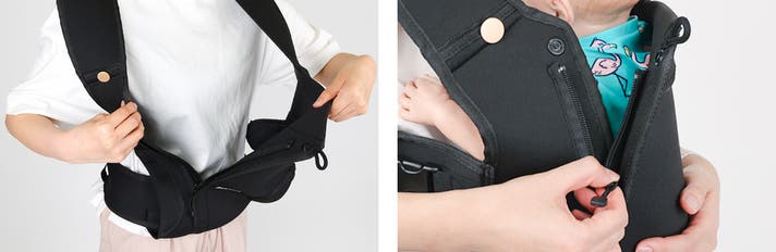赤ちゃんを高く持ち上げなくても抱っこできるガバッと開くフロントチャック!チャックは直接赤ちゃんの肌に当たらない仕様になっています!