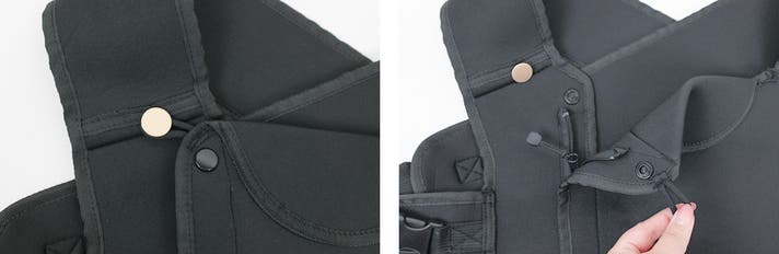 チャックの上を2つのボタンで留めて、意図せず開いてしまうのを防ぎます。