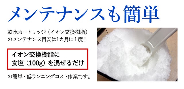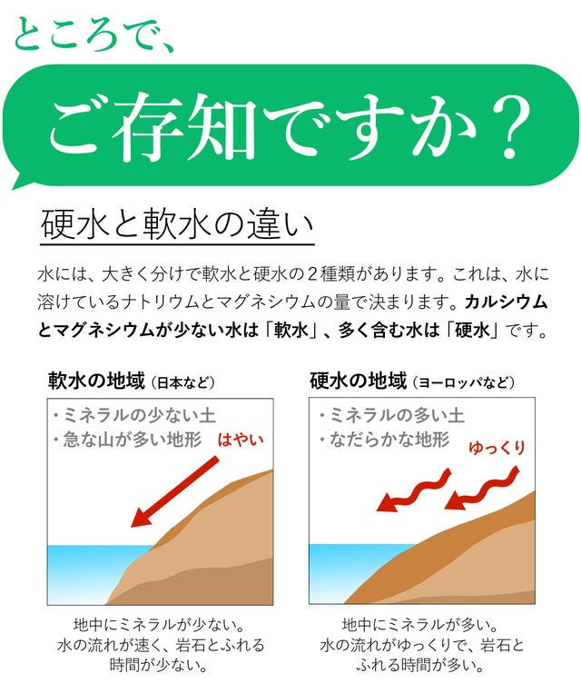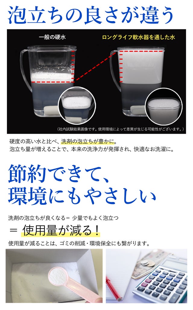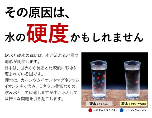 こちらも、実際のお客様のお悩みの声をたよりに開発した製品です。硬水地域にお住まいのお客様からの、「軟水機能はないの?」「硬水だと、洗濯物がゴワゴワしてしまうんです…」と言うかねてから聞いていたお声に、なんとか応えることはできないかと研究を重ね、やっとお客様に自信を持てご提供できる製品を開発することができました。