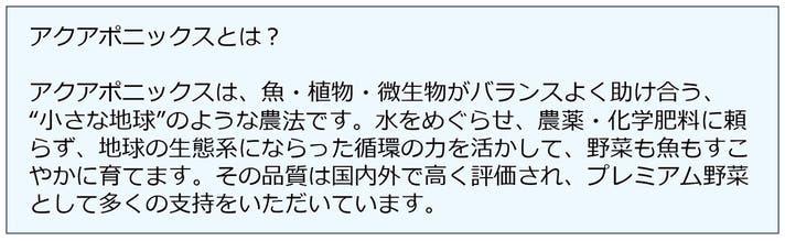 魚の育つ水が植物の栄養となり、植物がきれいにした水が再び魚へ戻ることで、水も肥料もムダのない循環が生まれ、かつ高品質なお野菜を育てることができています。