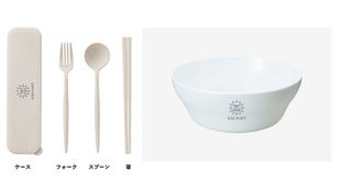 AQUAMOロゴ入りのカトラリーセット(スプーン、フォーク、箸)とサラダボウルのセットをお送りいたします。