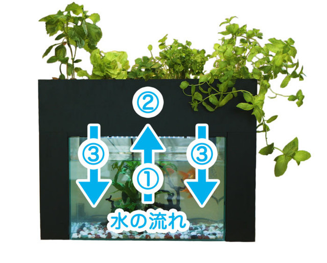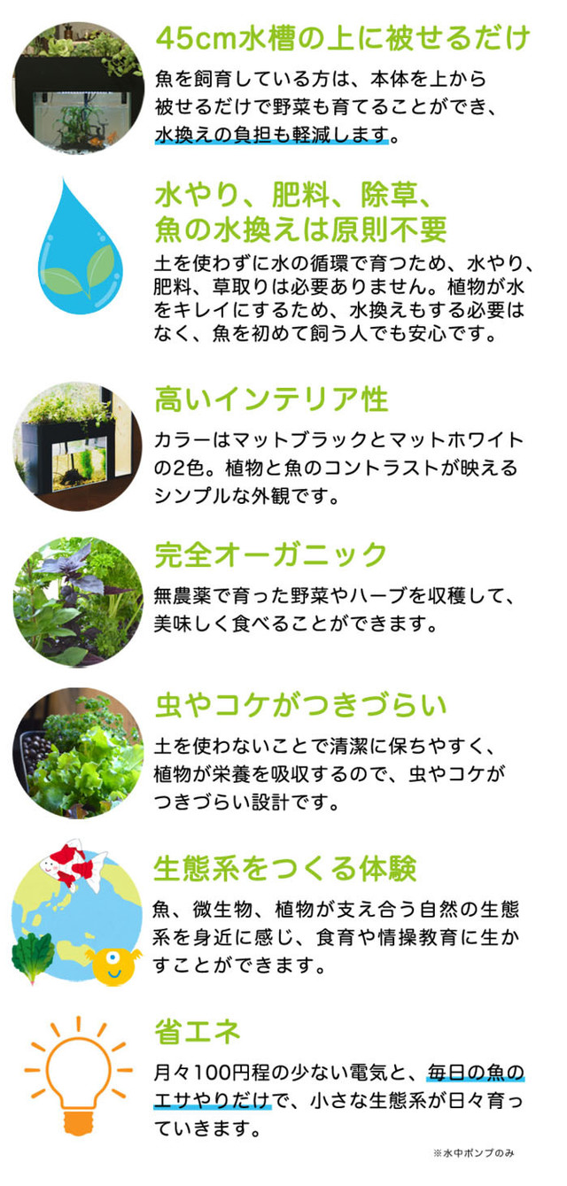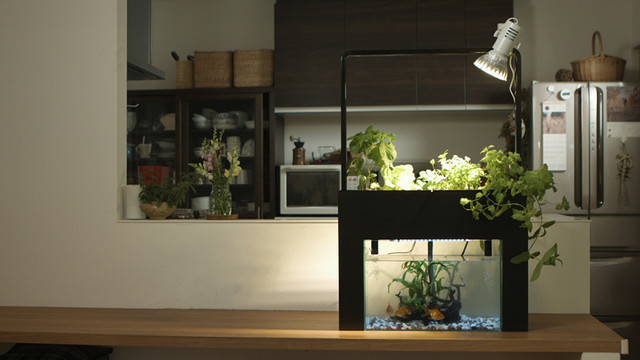 魚の力で野菜やハーブがすくすくと育ち、植物の力で水が浄化されます。魚、植物、そしてあなたもうれしい、まるで”小さな生態系”のような、これまでにない全く新しい商品です。