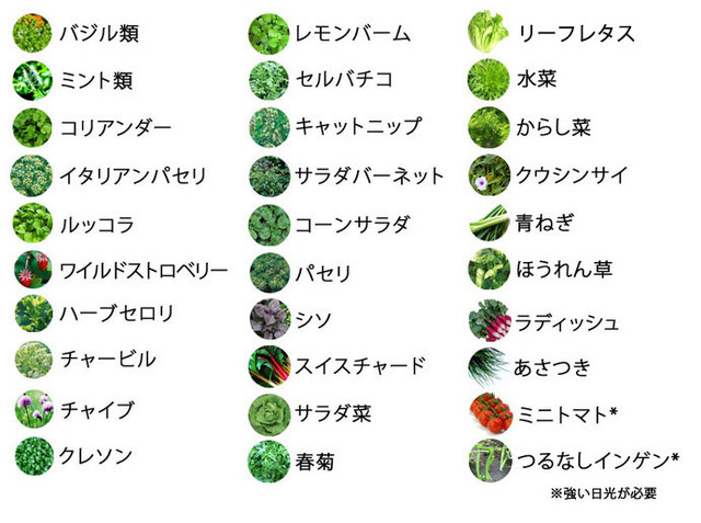 主に葉物野菜やハーブを育てることができます。品種にもよりますが、苗から育てると約3~4週間で収穫できます。