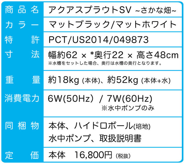●同梱物:アクアスプラウトSV本体、ハイドロボール(培地)、水中ポンプ、取扱説明書、水槽