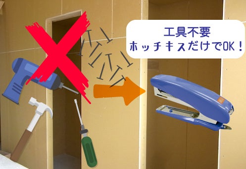1. 国内の多くの住宅の内壁材として使われている「石膏ボード」にご家庭にあるホッチキスで簡単に施工可能