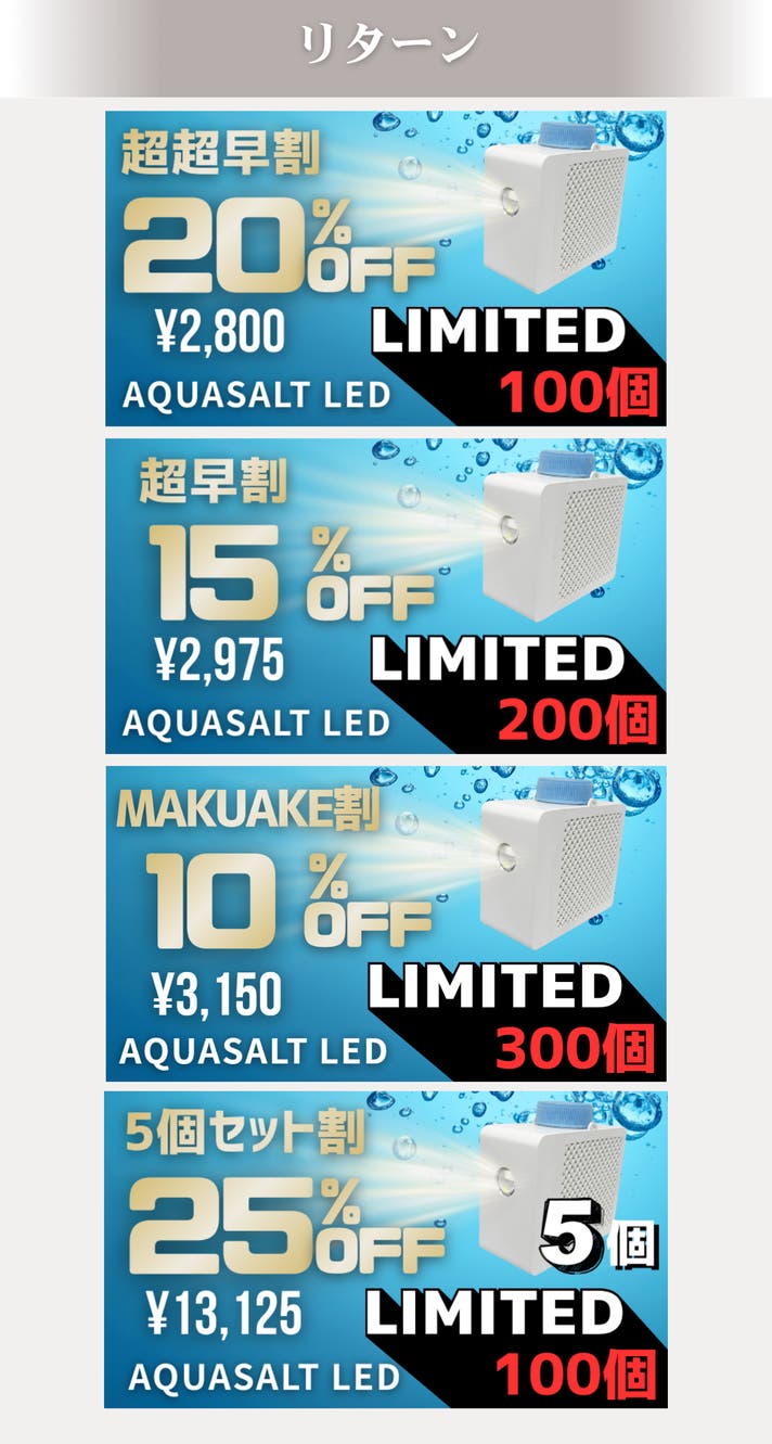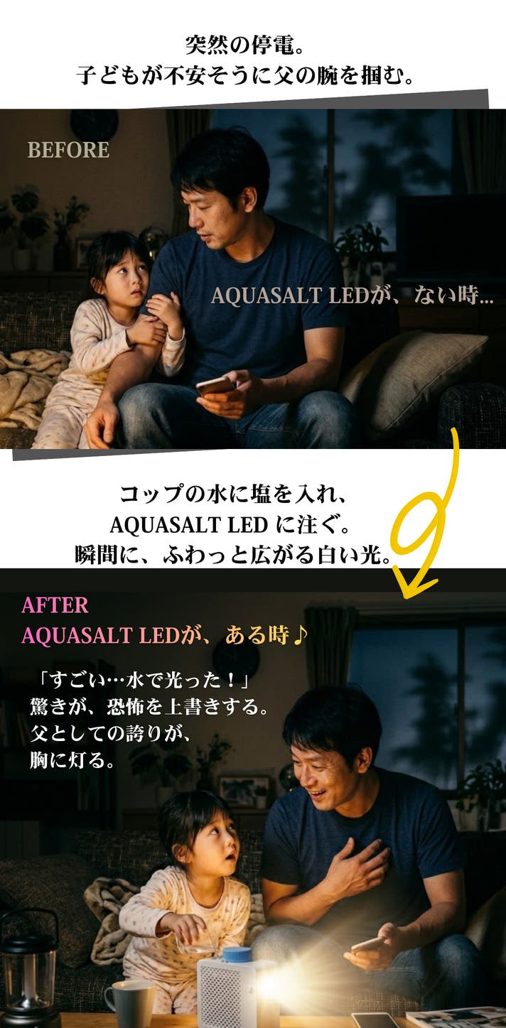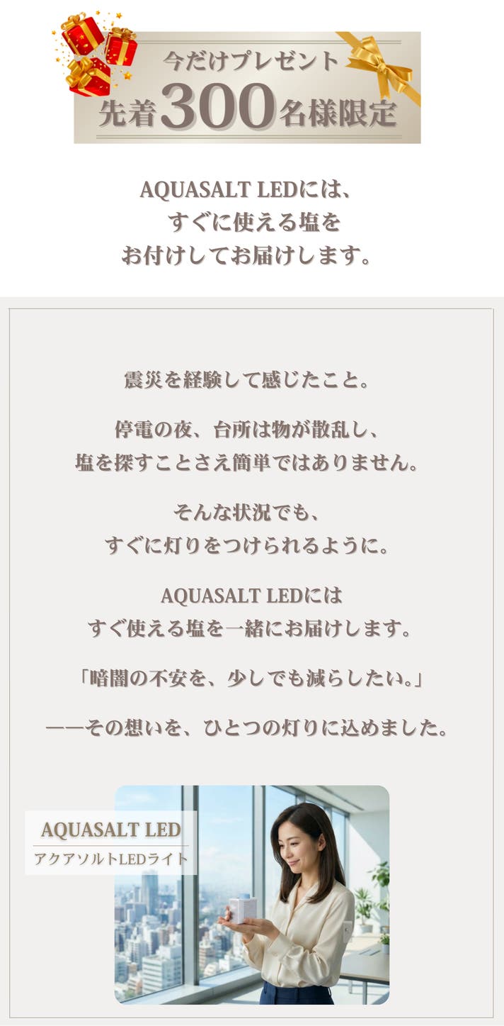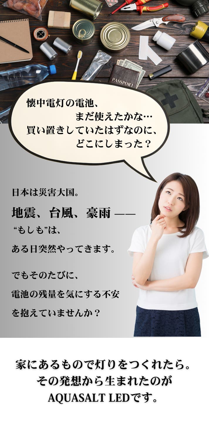 「Makuake(マクアケ)」は、実行者の想いを応援購入によって実現するアタラシイものやサービスのプラットフォームです。このページは、 プロダクトカテゴリの 「【水と塩だけで】約10年防災備蓄可能。電池不要・充電不要の塩水LEDライト」プロジェクト詳細ページです。