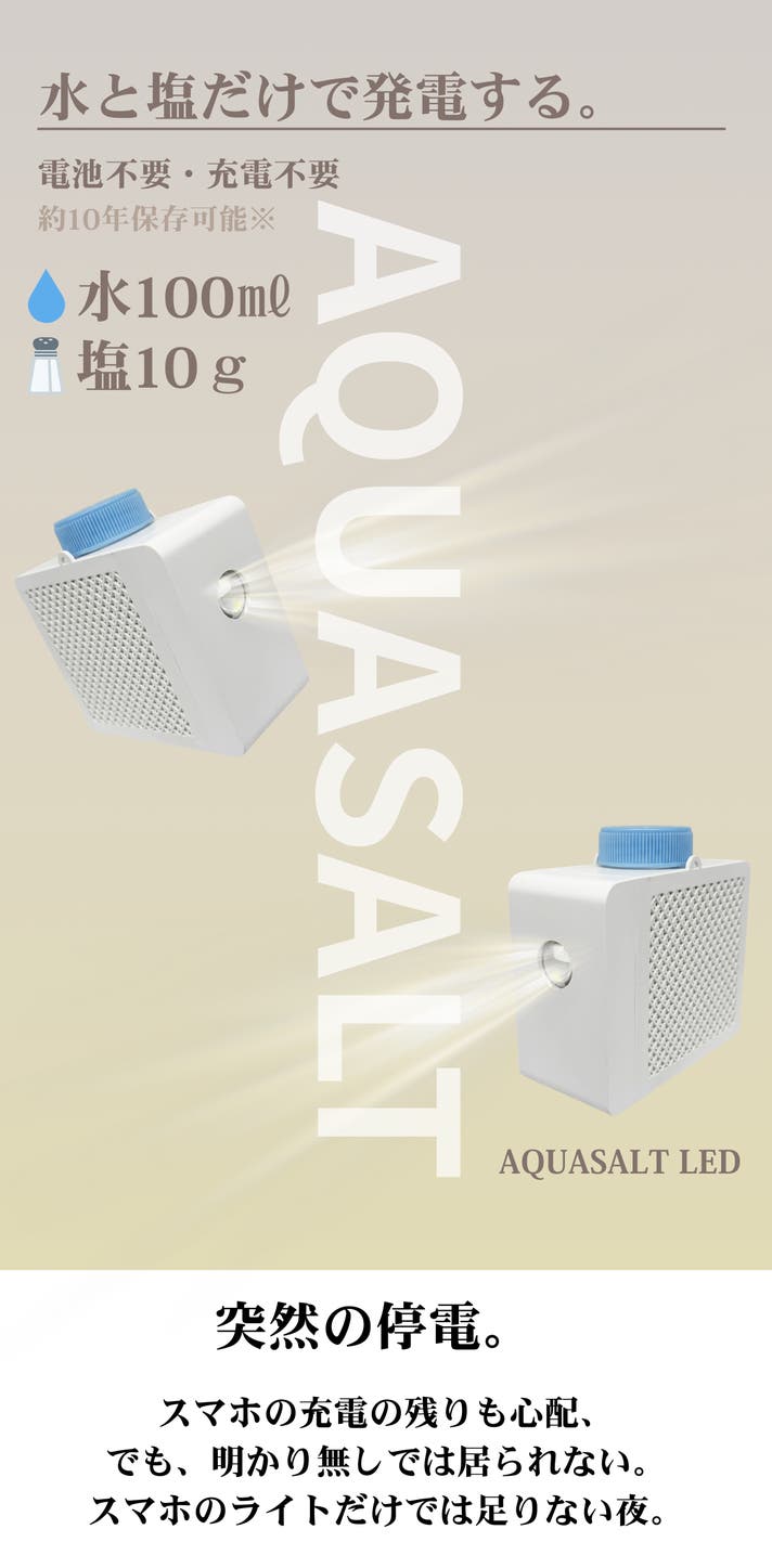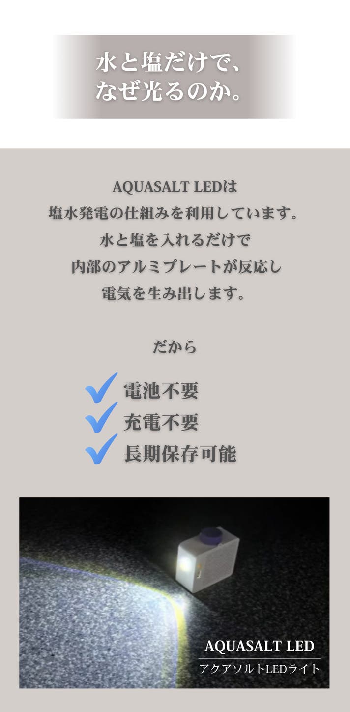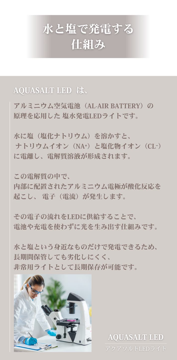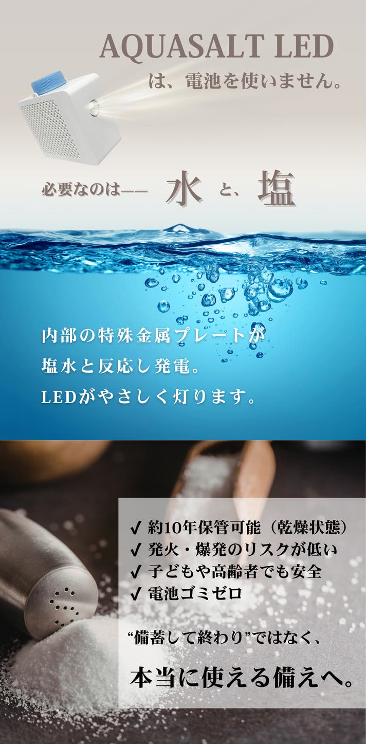 - 電池不要・充電不要・塩と水で電気が点く・瞬間LED点灯・コンパクト軽量!