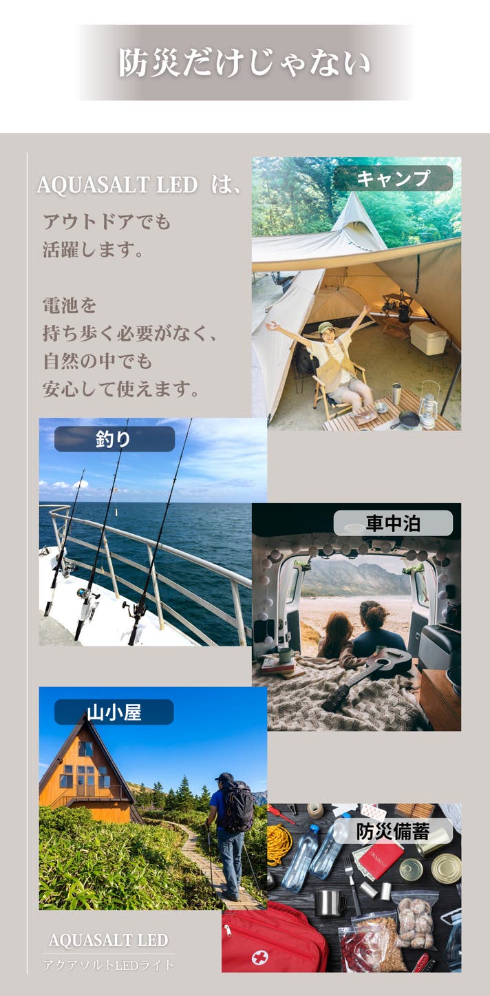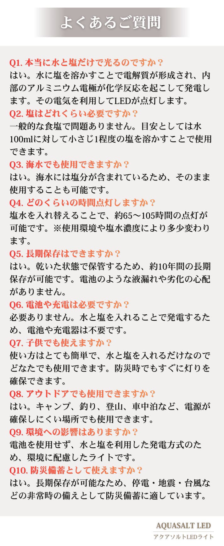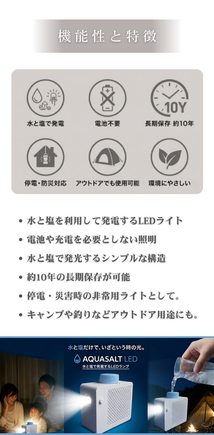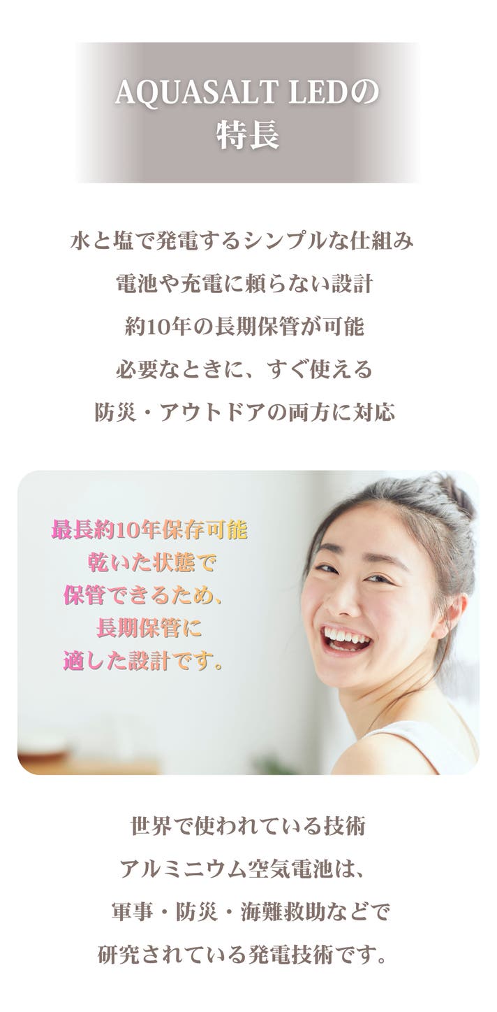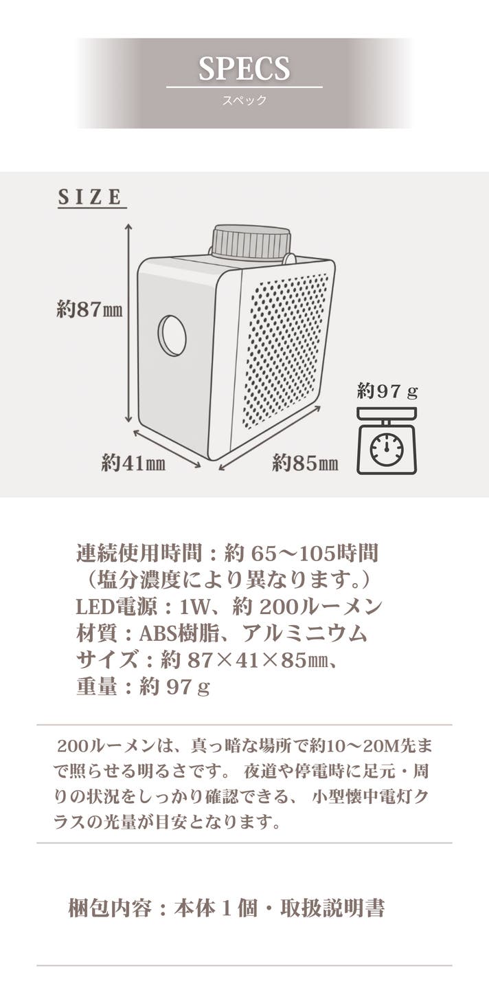 - 電池不要・充電不要・塩と水で電気が点く・瞬間LED点灯・コンパクト軽量!