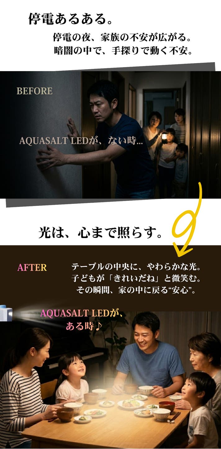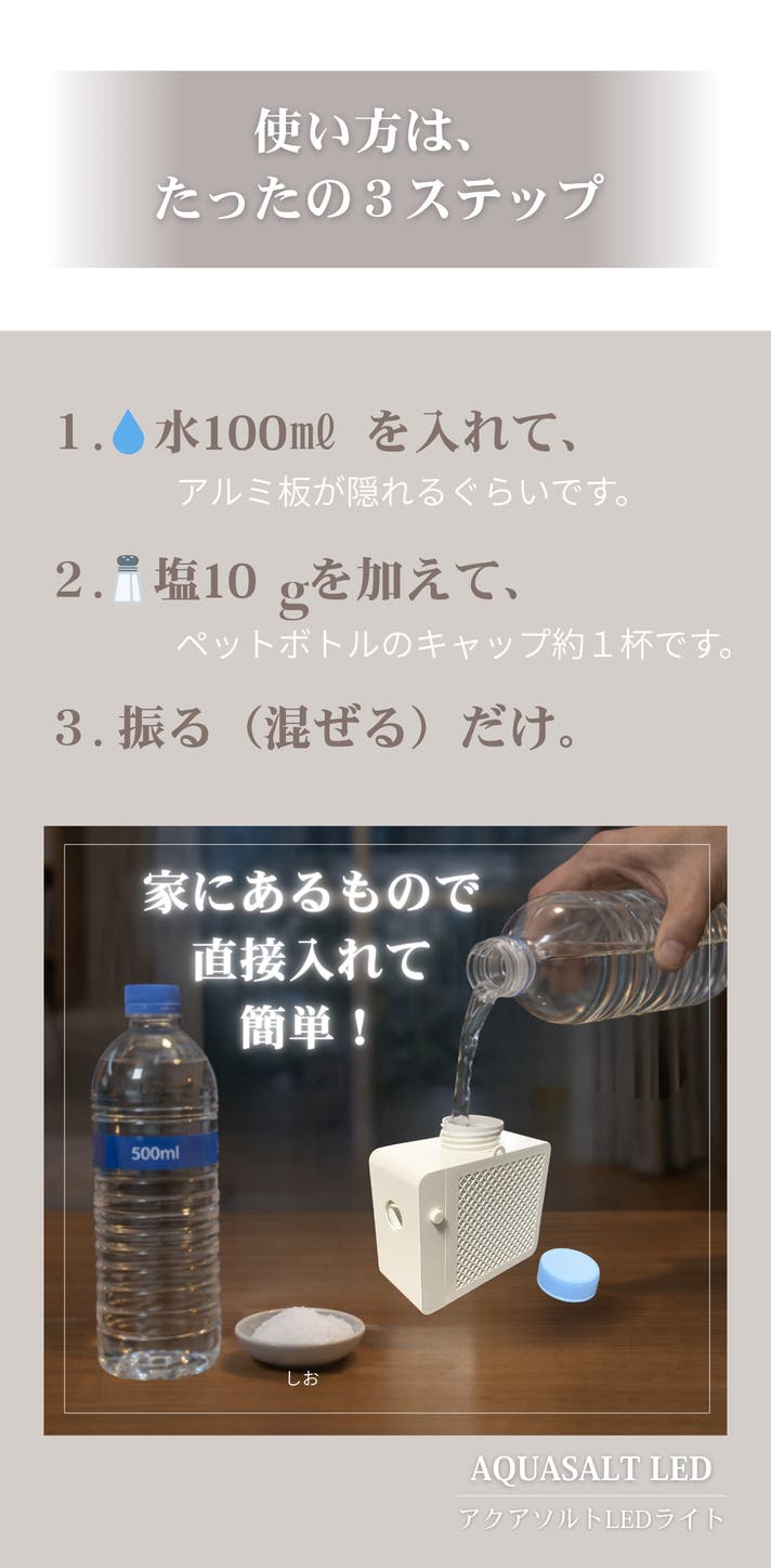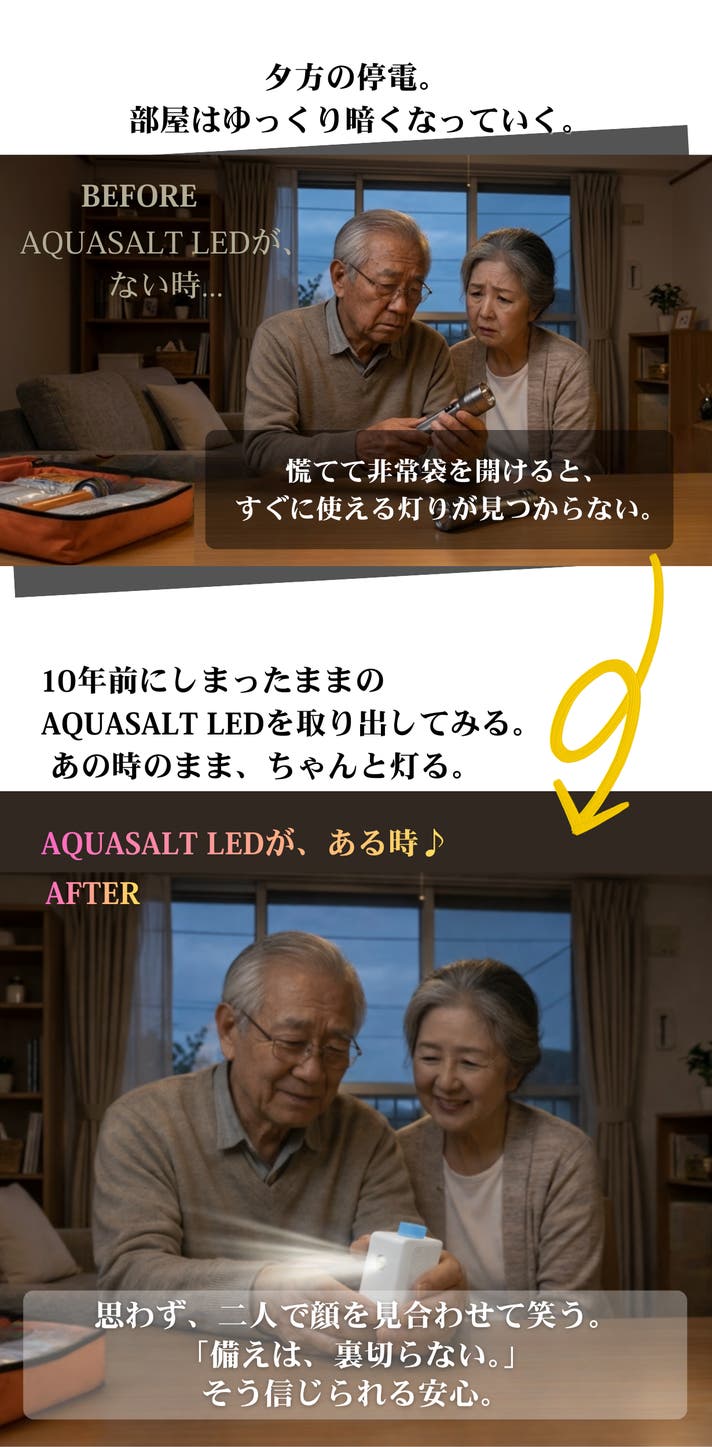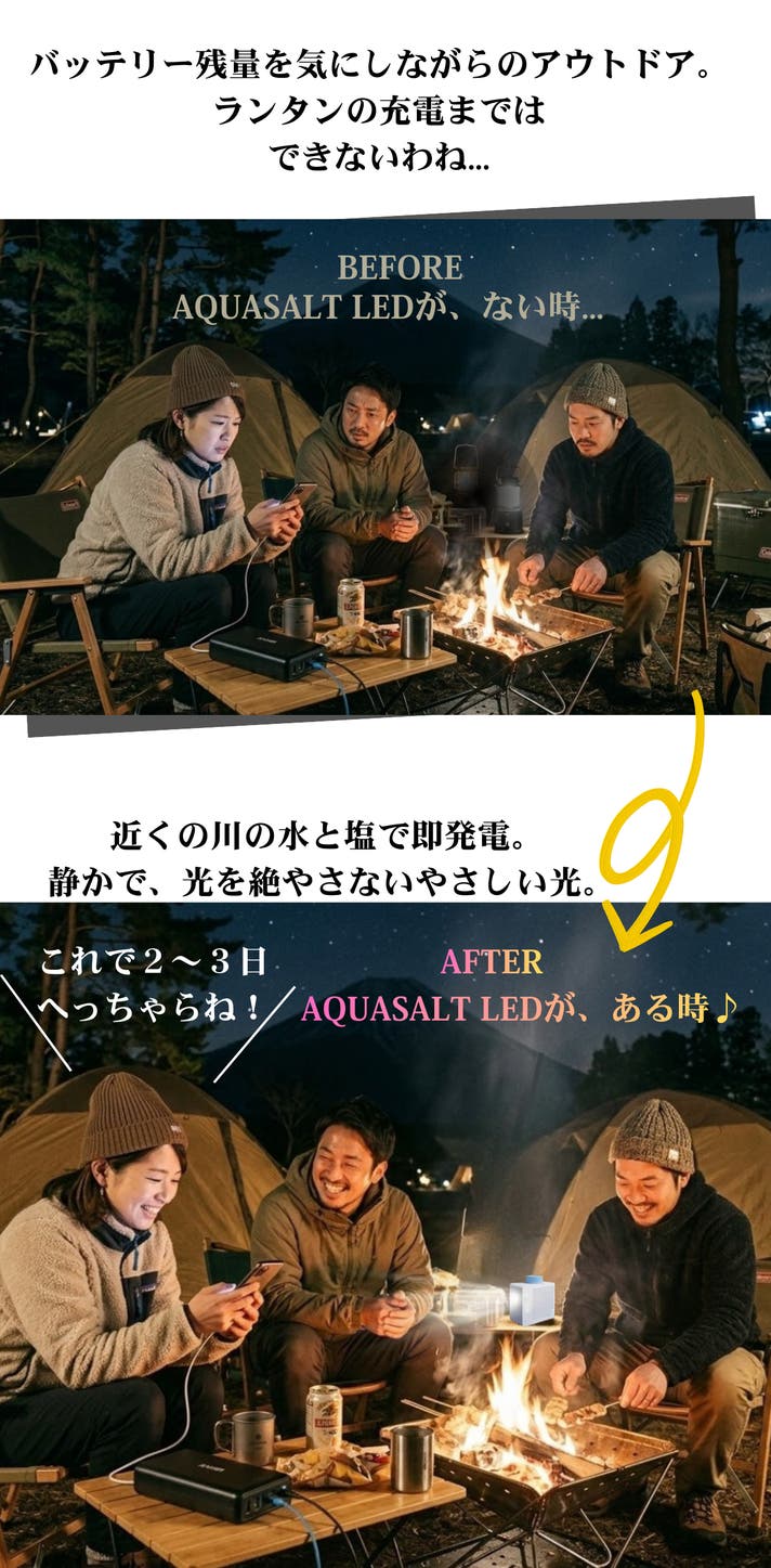- 電池不要・充電不要・塩と水で電気が点く・瞬間LED点灯・コンパクト軽量!