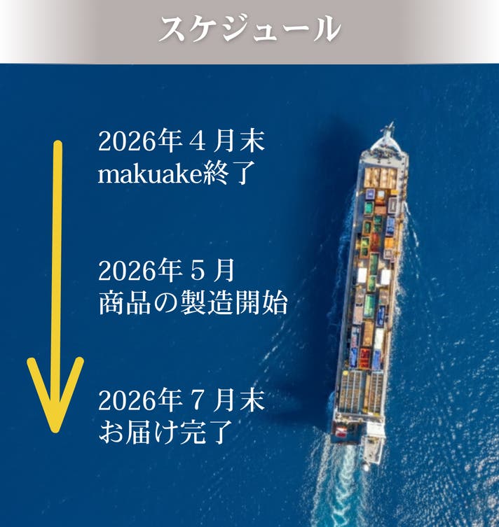 【配送遅延とキャンセルについて】 本文中に記載させていただいたスケジュールは、あくまでプロジェクト公開時点の予定です。応援購入の性質上、配送遅延のおそれがございます。原則として、配送遅延に伴う応援購入のキャンセルはできませんが、リターン配送予定月から 3ヶ月 を超えた場合には、希望者に限りキャンセルにて対応させていただきます。 【商品等の不具合による返品・交換】 原則として、サポーター都合によるキャンセル・返金は承っておりません。 (サポーター都合のキャンセル不可の例:サイズが合わない、誤注文、長期不在) ◾️対応条件: 商品の初期不良、またはお届けした商品がご注文内容と異なる場合、到着後14日以内にプロジェクトページの「実行者にメッセージ」よりご連絡ください。状況を確認の上、返金対応、または良品との交換対応をさせていただきます。 ◾️返金額: リターン金額(税込)の全額 ◾️返品送料/再送料: 実行者負担 【返品・交換をお受けできない商品】 ・サポーターの責任により破損、汚損が生じた商品 ・商品のタグ、付属品、パッケージ(箱、袋など)を紛失、破棄された商品 ・事前にご連絡をいただいていない商品 ・商品到着後、15日以上経過した商品 【交換をお受けできないケース】 ・限定品や同一商品の在庫がない場合など、代替品をご用意できない商品 ※並行輸入品が発生する可能性があります。個人輸入及び販路によっては防ぐことができない可能性がある点、ご了承願います。 ※想定を上回る皆様から応援購入を頂き、量産体制を更に充実させることができた場合、一般販売価格が予定価格を下回る可能性がございます。 Makuakeの性質上、以上の注意点につきましてあらかじめご理解とご了承いただいた上で応援購入くださいますよう、よろしくお願い申し上げます。