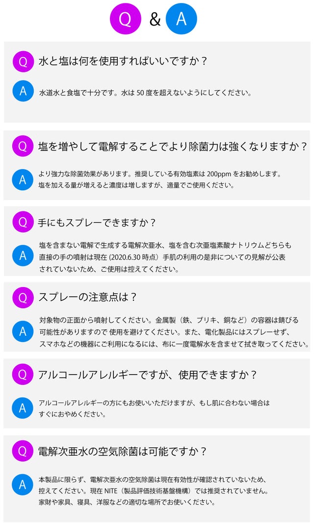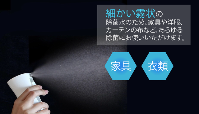 ●空間除菌の有効性は現在のところ確認されておりませんので、本製品に関わらず次亜水や次亜塩素酸ナトリウムを加湿器などを使って次亜塩素酸水を空気中に噴霧することは控えてください。