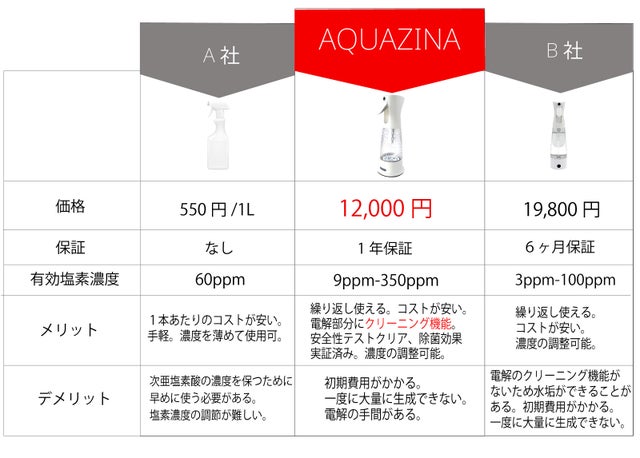 AQUAZINAは電解次亜水・次亜塩素酸ナトリウムの生成器です。水、または水と塩を電気分解することで、電解水を生成します。高い除菌効果を発揮し、安全性にも配慮した濃度で家庭用に製造しました。除菌や脱臭にも安定して使用できる電解水をご家庭の様々なシーンでお使いいただけます。