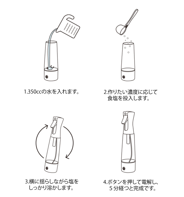 お使いになるシーンに合わせて、濃度の調整がご自身で可能です。日常的な除菌だけでなく、嘔吐物などの緊急の除菌の際は塩分濃度を上げていただくことで、有効塩素濃度が上がるため、除菌効果が上がります。
