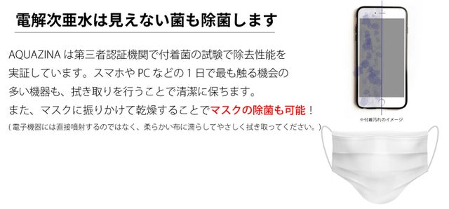 ※次亜塩素酸ナトリウムとしてお使いいただく場合は、電解次亜水に比べて塩素臭を感じます。また、酸性のものと混合させずにお使いください。