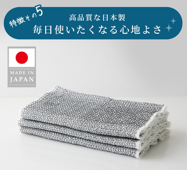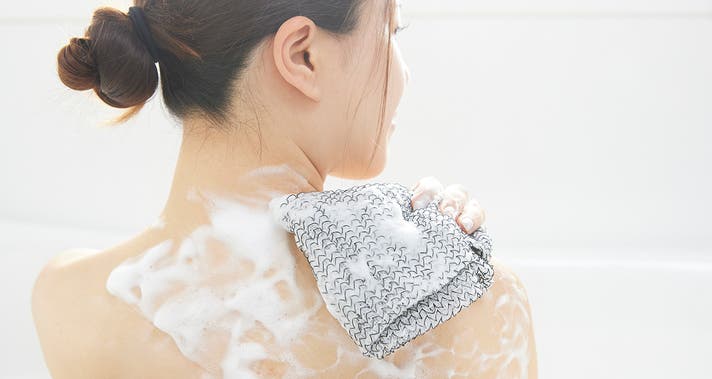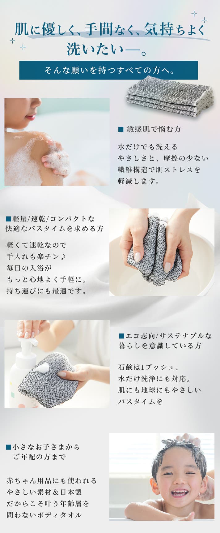 水やぬるま湯だけでも皮脂や汚れを落とせるため、石鹸やボディソープの使用量を抑えられ、肌にも環境にもやさしい新しい入浴習慣を実現。また、石鹸・ボディソープとの相性も抜群で、泡立ちや水切れが良いため、洗い心地も快適です。何度洗っても色落ちしにくい!シンプルで目を引くデザイン。