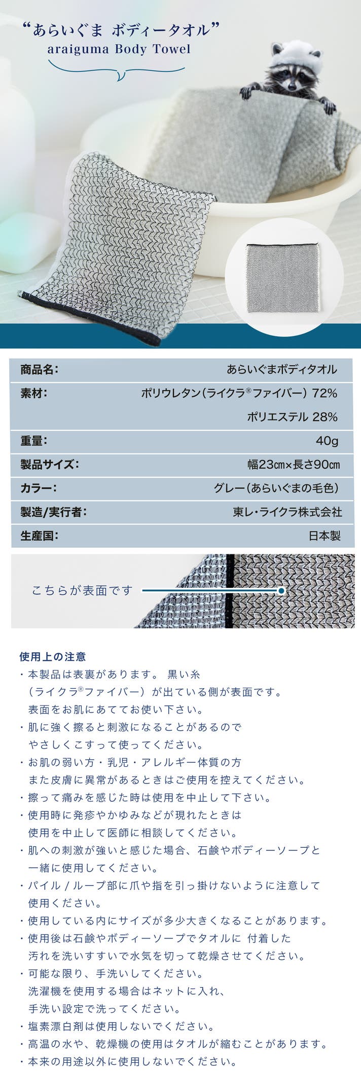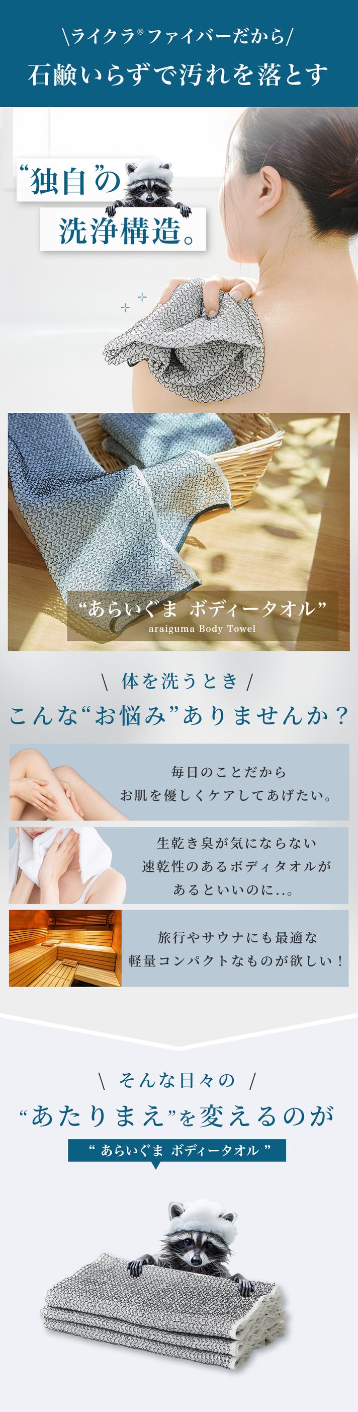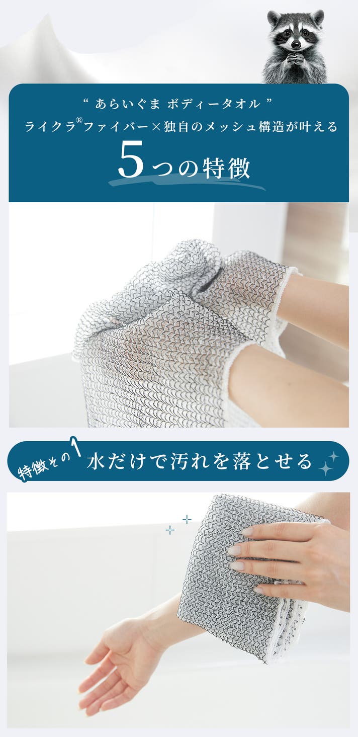 肌にも環境にもやさしい新発想の“あらいぐま ボディタオル”は、水やぬるま湯だけで皮脂や汚れを落とせる、肌にやさしく環境にも配慮した新しいボディタオルです。