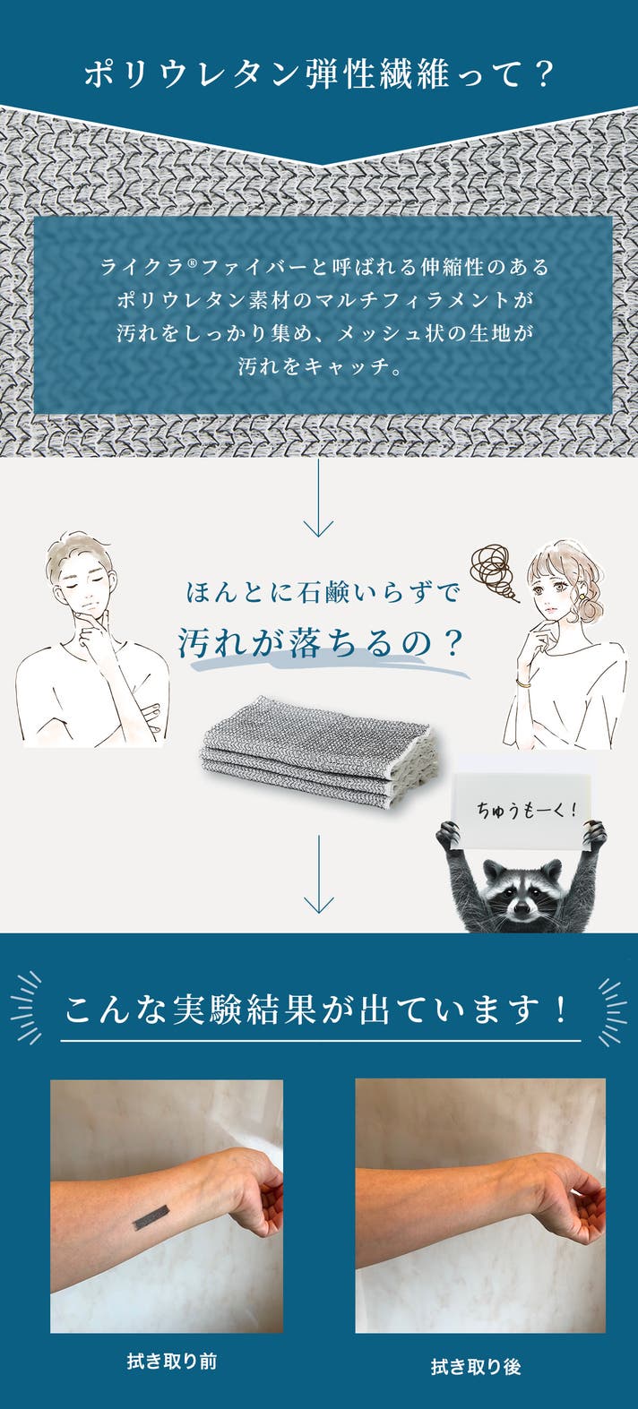 - ライクラ®ファイバーが肌表面の皮脂や汚れを落とすから、水またはぬるま湯だけでしっかり洗浄