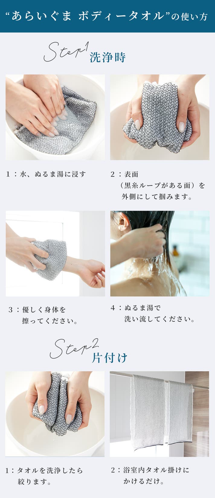 ※使用後は石鹸やボディソープでタオルに付着した汚れを洗いすすいで水気を切って乾燥させてください。