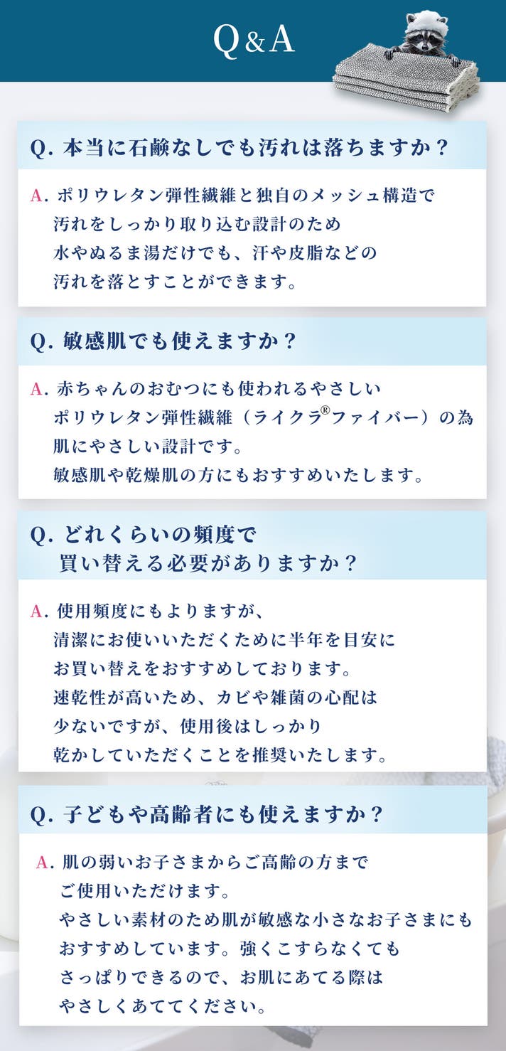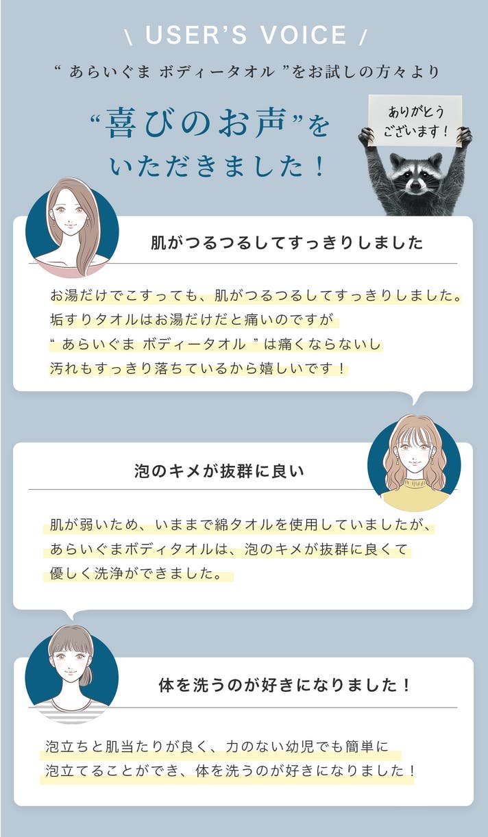 ”あらいぐま ボディタオル”は、強くこすらなくても、しっかりと汚れが落ちるので、肌への刺激が気になる方にもおすすめです!