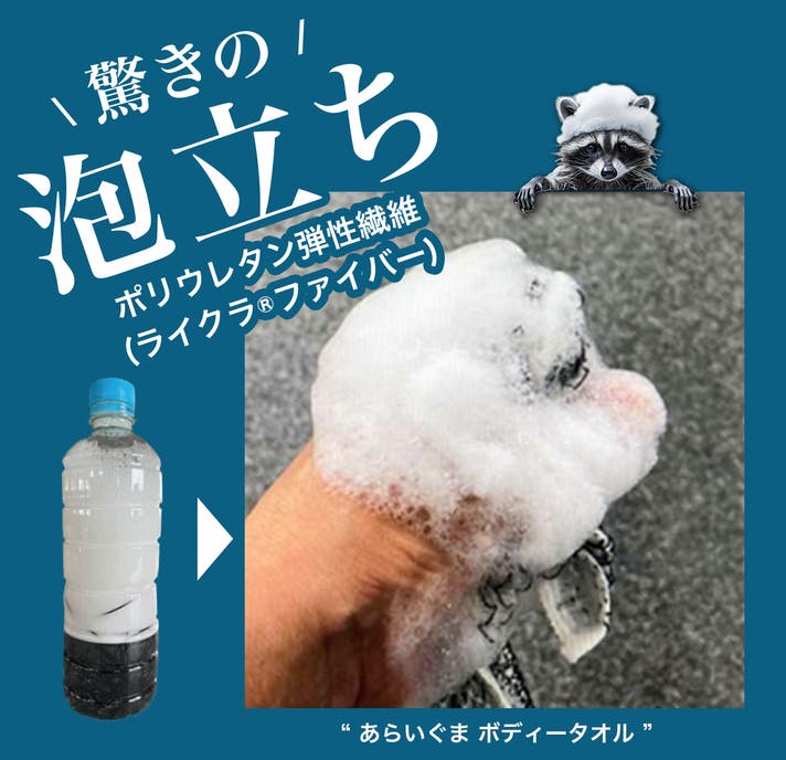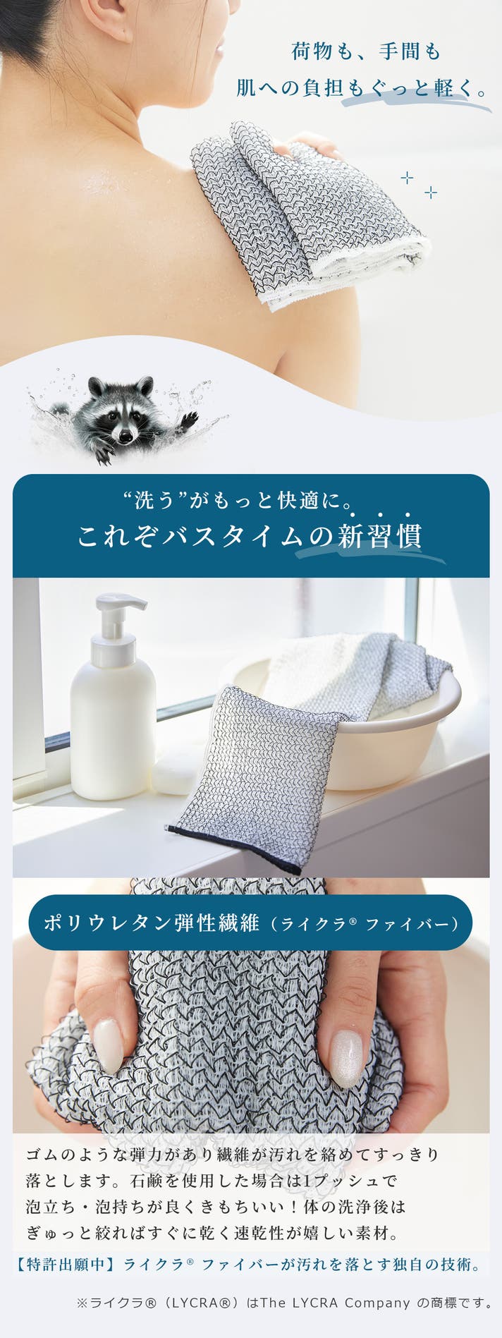 そして誕生したのが、“あらいぐま ボディタオル”。ライクラ®ファイバーの特性を活かし、肌にやさしく皮脂や汚れをしっかり落とせる新しいボディタオルです。(特許出願中)