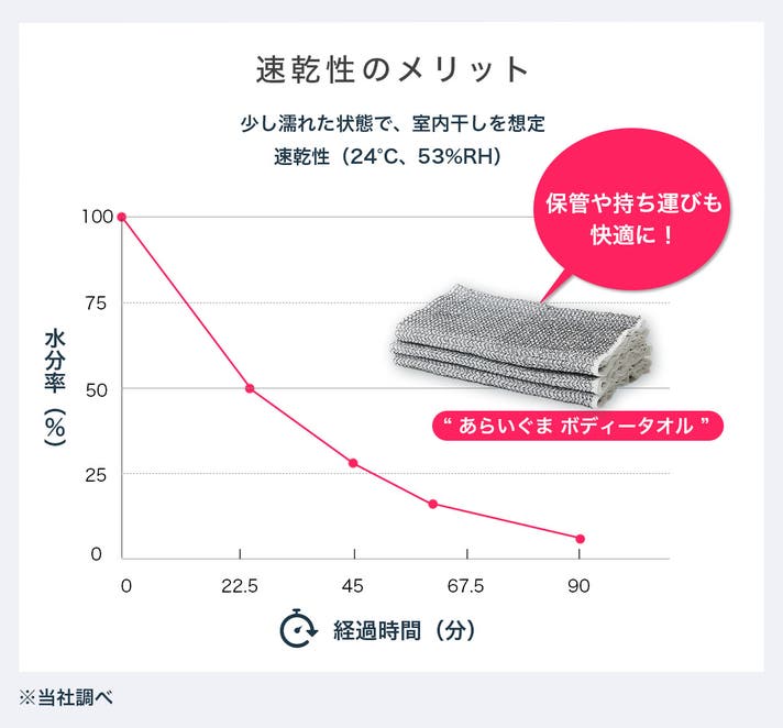 “あらいぐま ボディタオル”は、約30分で水分量が半分以上激減し、驚きの速乾性を発揮しました。その後約90分でタオル全体がほぼ乾燥しました。