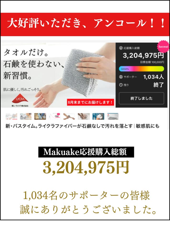 「Makuake(マクアケ)」は、実行者の想いを応援購入によって実現するアタラシイものやサービスのプラットフォームです。このページは、 コスメ・ビューティーカテゴリの 「【アンコール】新バスタイム。ライクラファイバーが石鹸なしでキレイ|敏感肌にも」プロジェクト詳細ページです。