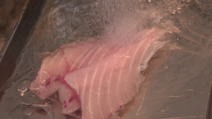 ①真空状態のまま3〜5分程流水解凍する。