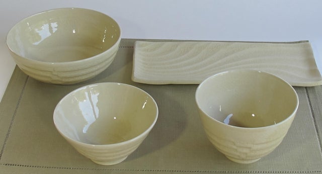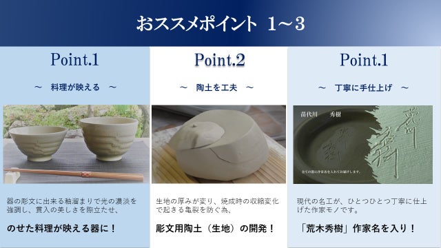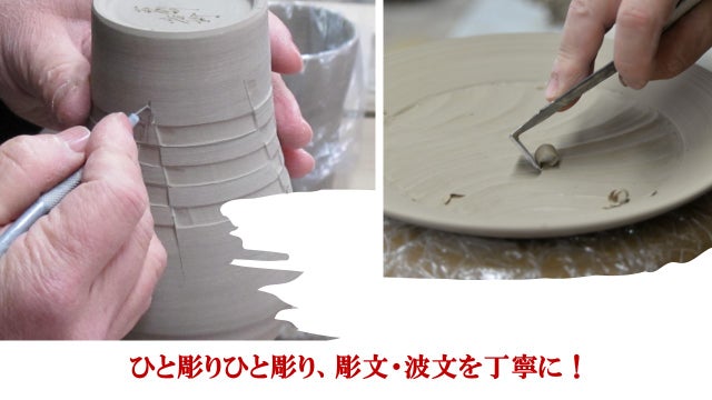 およそ20年をかけ、伝統の窯元伝承の作陶技法と 西部工芸展・朝日新聞社大賞 / 日本伝統工芸展・入選 等を受賞した、日本大学芸術学部美術科彫刻専攻科時代に培った彫刻技術を融合させ 彫文模様と波文模様を器に表現し 料理が映える