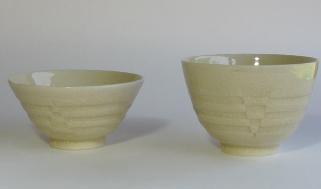 第35回記念西部工芸展(日本工芸会※・朝日新聞社主催)で大賞を受賞した「彫文壺」の幾何学文様の彫文技を「彫文飯碗」「彫文汁碗」「彫文サラダボウル」に、
