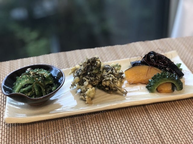 ▼ゴーヤの甘酢昆布和え、もずくの天ぷら、野菜の揚げ浸しを「角皿」に盛って。