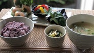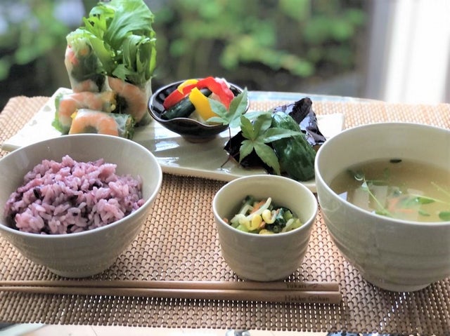 ▼黒米ごはん、塩麴ナムル、味噌汁、塩麴チキンの生春巻き、甘酒ピクルス、茄子の揚げ浸しを「飯碗」「汁碗」「角皿」で。