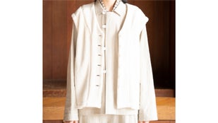 ブルガリア軍のパジャマをベースに前あきのボタンは掛けやすいよう布ループで作成しました。ラフさを出すために背面の接ぎはなくしています。またボタンは貝ボタンを使用し繊細さをプラス。そのままリモートワークでも気にならないデザインで家の中のオンモードで使用するイメージをしました。