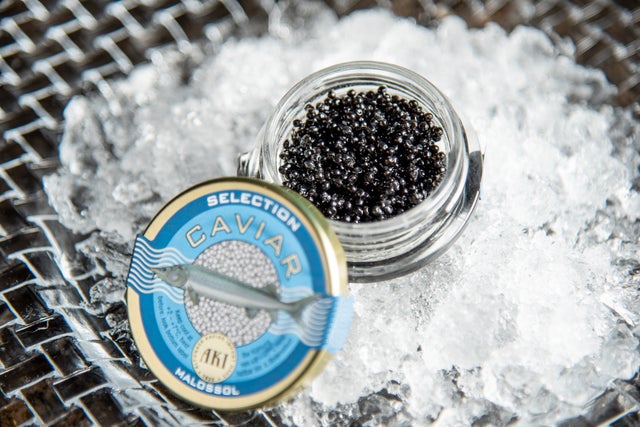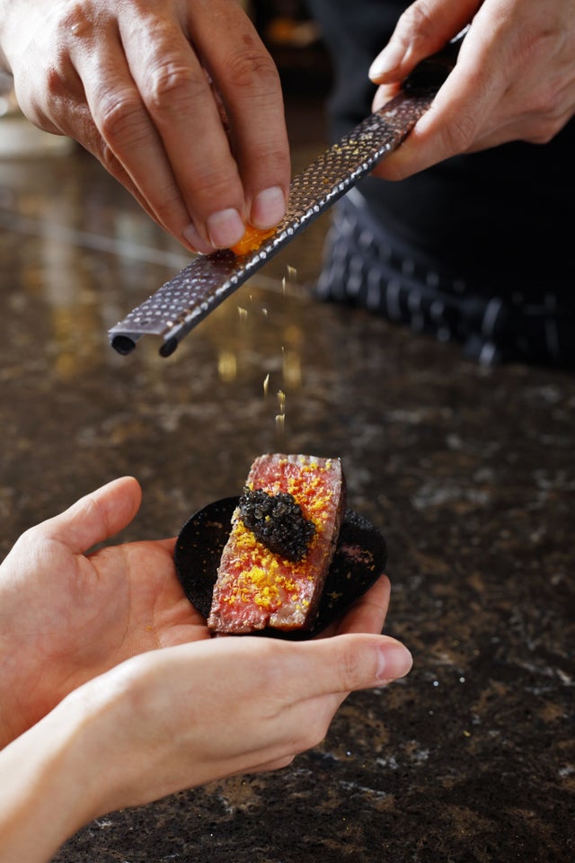 国産黒毛和牛サーロインと海の幸のキャビアをたっぷりの乗せ、イカ墨のクレープで包んだ一品です。キャビアの塩味とサーロインの程よい脂が合わり、お肉の旨味を最大限に引き出しました。口の中で濃厚な旨味が広がります。