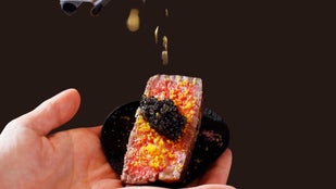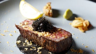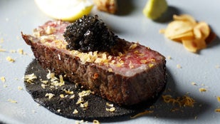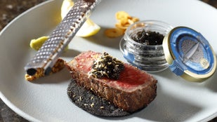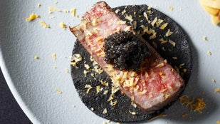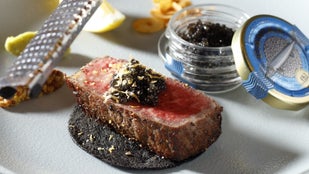 黒毛和牛サーロインステーキ キャビアとカラスミ添え イカ墨クレープ包み