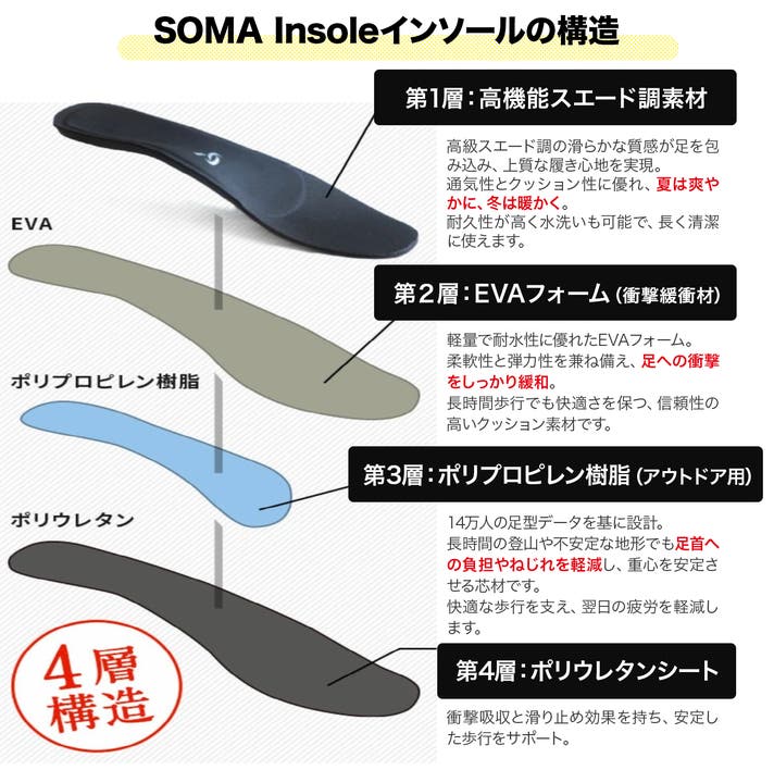 SOMA Insole(ソーマ・インソール)は、14万人の足型データに基づく設計と、長年の研究知見をもとに開発された「アウトドア専用インソール」です。