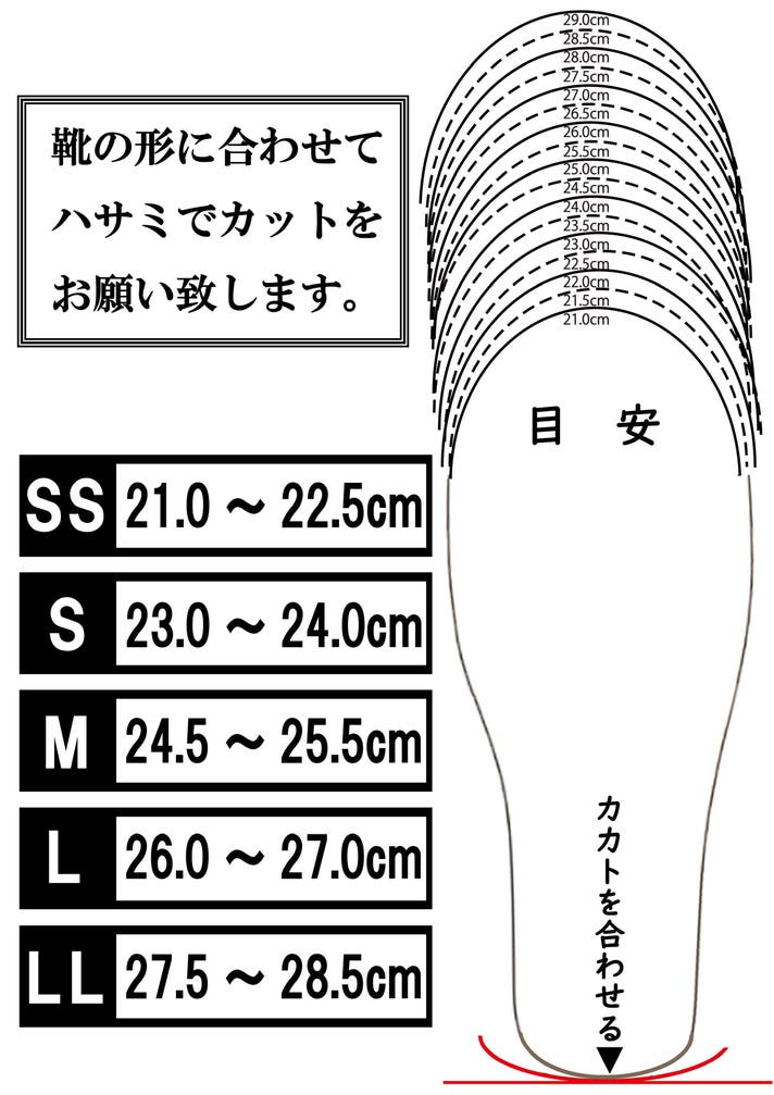 ・サイズ: SSサイズ(21.0cm~22.5cm)、Sサイズ(23.0~24.0cm)、Mサイズ(24.5~25.5cm)、Lサイズ(26.0~27.0cm)、LLサイズ(27.5~28.5cm)