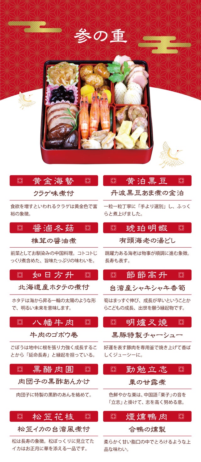 - 素材にこだわった逸品。三段重にフカヒレ、伊勢海老まで揃ってる中華お節は一年一度のご褒美。