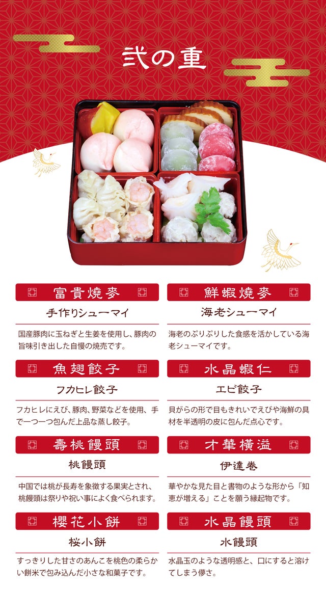 フカヒレは古来、中国でも縁起の良い高級食材として珍重されており、その形から“翼”をイメージし、「飛躍」の意味がこめられています。また、腰が曲がった様な姿の海老は長寿の象徴。 貝類では、寿命が長いアワビ、豊作祈願の田作りのほか、松笠イカの型が生命力を高めるも示してます。