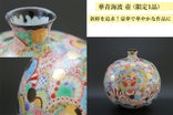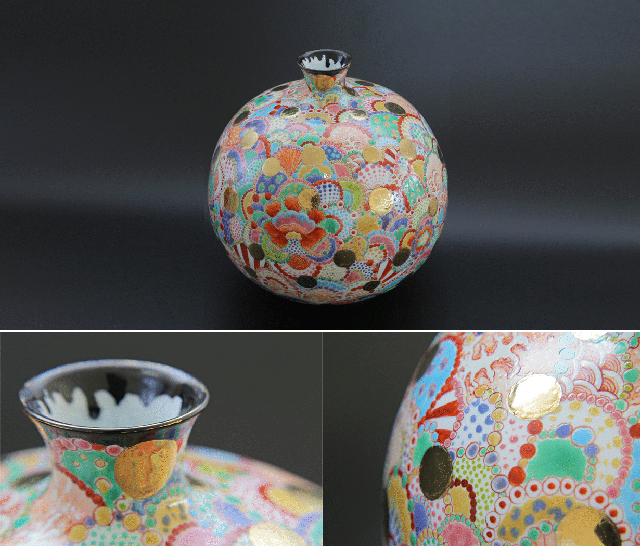 フリーハンドで絵柄を描き、なんどもなんども色絵をつけ、10回以上も窯入れをして完成した大作。純金を使った水玉模様が豪華で華やかなアクセント。