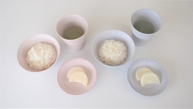 柄も従来の食器とは異なり、初夏や真夏に涼しさを感じる淡いピンクとブルーで、海のさざ波をモチーフにした画期的な食器です。